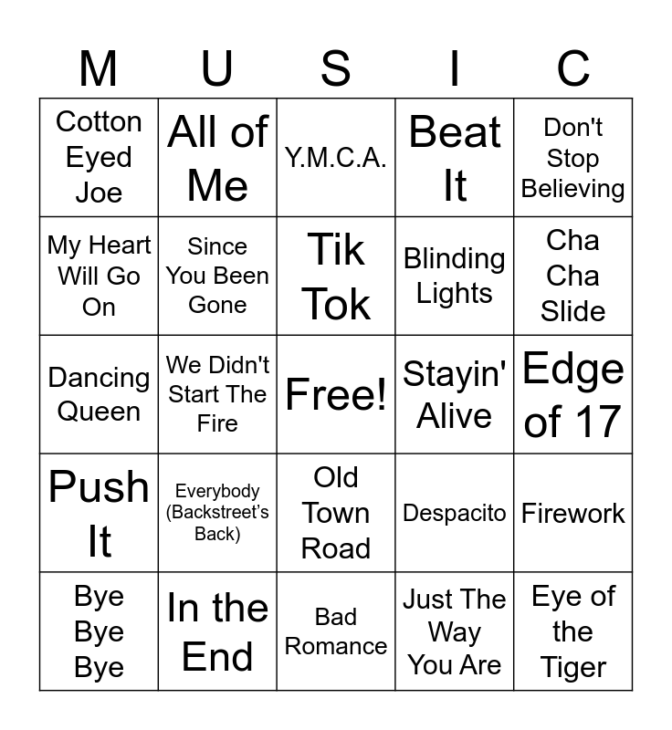 This bingo card has a free space and 71 words: A Thousand Miles, All of Me, Another One Bites the Dust, As Long As You Love Me, Bad Romance, Barbie Girl, Beat It, Billie Jean, Blinding Lights, Bohemian Rhapsody, Bye Bye Bye, Call Me Maybe, Cha Cha Slide, Cotton Eyed Joe, Counting Stars, Dancing Queen, Despacito, Don't Stop Believing, Dynamite, Edge of 17, Everybody (Backstreet’s Back), Eye of the Tiger, Firework, Gangnam Style, Happy, Hey Ya!, Hey, Soul Sister, Hit Me Baby One More Time, I Wanna Dance with Somebody, I Want it That Way, In the End, Jenny (867-5309), Jessie’s Girl, Johnny B Good, Just The Way You Are, Like a Prayer, Lose Yourself, Macarena, My Heart Will Go On, No Scrubs, Old Town Road, Party in the USA, Push It, Rhythm of the Night, Right Round, Rockstar, September, Since You Been Gone, Single Ladies (Put a Ring on it), Someone Like You, Sorry, Starships, Stayin' Alive, Sweet Child ‘O Mine, The Edge of Glory, Thriller, Tik Tok, Titanium, Toxic, U Can’t Touch This, Uptown Funk, Wannabe, We Didn't Start The Fire, We Will Rock You, What Makes You Beautiful, Wobble, Y.M.C.A., You Belong With Me, You Give Love a Bad Name, You Got It (The Right Stuff) and Ghost.