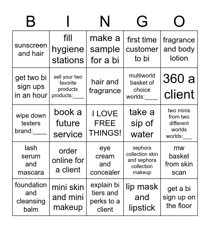 This bingo card has a free space and 24 words: order online for a client, mini skin and mini makeup, hair and fragrance, foundation and cleansing balm, fragrance and body lotion, sunscreen and hair, get two bi sign ups in an hour, fill hygiene stations, take a sip of water, eye cream and concealer, multiworld basket of choice worlds:____, wipe down testers brand:____, sephora collection skin and sephora collection makeup, mw basket from skin scan, sell your two favorite products products:____, lip mask and lipstick, two minis from two different worlds worlds:___, make a sample for a bi, 360 a client, book a future service, get a bi sign up on the floor, lash serum and mascara, first time customer to bi and explain bi tiers and perks to a client.