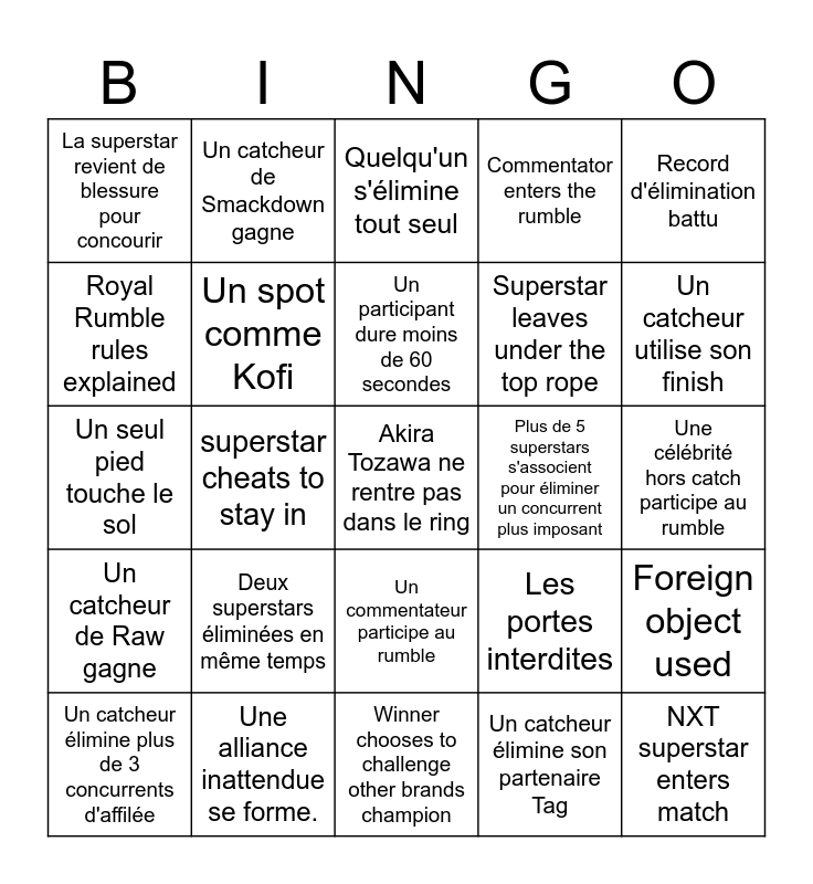 This bingo card has a free space and 34 words: Une légende de wwe rejoint match, Un catcheur élimine son partenaire Tag, Le commentateur désigne son favori pour le vainqueur, Retour Surprise, Un catcheur de Raw gagne, Un spot comme Kofi, Record d'élimination battu, Un catcheur élimine plus de 3 concurrents d'affilée, Un catcheur de Smackdown gagne, Un Champion AVEC son titre fais son entrée, Un participant dure moins de 60 secondes, Quelqu'un s'élimine tout seul, Une arme est utilisée, Le record du temps a été battu., Plus de 5 superstars s'associent pour éliminer un concurrent plus imposant, Un catcheur utilise son finish, Une alliance inattendue se forme., Un seul pied touche le sol, Deux superstars éliminées en même temps, Les portes interdites, Un commentateur participe au rumble, Il y a un OMG moment, La superstar revient de blessure pour concourir, Une célébrité hors catch participe au rumble, Winner chooses to challenge other brands champion, NXT superstar enters match, Commentator enters the rumble, Non-rumble participant interference, Superstar leaves under the top rope, Royal Rumble rules explained, HBK mentioned by commentators, superstar cheats to stay in, Foreign object used and Superstar returns after elimination.