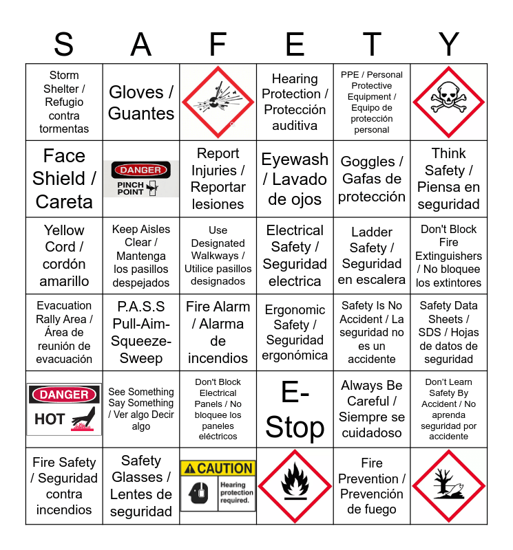 This bingo card has 15 images and 60 words: Think Safety / Piensa en seguridad, E-Stop, Yellow Cord / cordón amarillo, "CLEAR!", PPE / Personal Protective Equipment / Equipo de protección personal, Safety Glasses / Lentes de seguridad, Goggles / Gafas de protección, Face Shield / Careta, Gloves / Guantes, Hearing Protection / Protección auditiva, Clean as you go / Limpieza continua, Avoid Slips, Trips, & Falls / Evite resbalones, tropezones y caídas, Safe Lifting Techniques / Técnicas de levantamiento seguras, Chemical Labels / Etiquetas químicas, GHS Labels / Etiquetas GHS, Fire Safety / Seguridad contra incendios, Fire Extinguisher / Extintor de incendios, Machine Guards / Protectores de máquinas, Evacuation Rally Area / Área de reunión de evacuación, Eyewash / Lavado de ojos, Report Injuries / Reportar lesiones, Fall Protection / Protección contra caídas, Report Safety Hazards / Informar peligros de seguridad, Use Designated Walkways / Utilice pasillos designados, Safety Data Sheets / SDS / Hojas de datos de seguridad, Team Lift / Levantamiento de equipo, Stretch & Flex / Estirar y flexionar, Lockout-Tagout / Bloqueo y etiquetado, Safety Gates / Puertas de seguridad, Safety Beams / Vigas de seguridad, See Something Say Something / Ver algo Decir algo, Fire Alarm / Alarma de incendios, Storm Shelter / Refugio contra tormentas, Emergency Exit / Salida de emergencia, Don't Block Walkways / No bloquees los pasillos, Don't Block Electrical Panels / No bloquee los paneles eléctricos, Don't Block Fire Extinguishers / No bloquee los extintores, First Aid Kit / Kit de primeros auxilios, Fire Prevention / Prevención de fuego, Run, Hide, Fight / Correr-ocultar-lucha, Practice Good Housekeeping / Practique una buena limpieza, Always Be Careful / Siempre se cuidadoso, Safety Committee / Comité de Seguridad, Caution / Precaución, Spill Kit / Kit de limpieza de derrames, Ladder Safety / Seguridad en escalera, Teamwork Improves Safety / El trabajo en equipo mejora la seguridad, Danger / Peligro, Warning / Advertencia, Stop Accidents Before They Stop You / Pon alto a los accidentes antes de que te ¡detengan!, Keep Aisles Clear / Mantenga los pasillos despejados, Don’t Learn Safety By Accident / No aprenda seguridad por accidente, Report Unsafe Conditions / Reportar condiciones inseguras, Sharps Container / Contenedor de objetos punzantes, P.A.S.S Pull-Aim-Squeeze-Sweep, Electrical Safety / Seguridad electrica, Ergonomic Safety / Seguridad ergonómica, Always Be Careful / Siempre Se Cuidadoso, Safety Is No Accident / La seguridad no es un accidente and Don’t Stand On Pallets / No te pares sobre paletas.