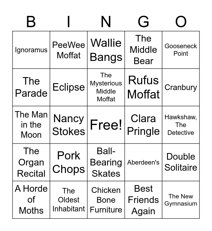 This bingo card has a free space and 24 words: Pork Chops, The Oldest Inhabitant, The Mysterious Middle Moffat, A Horde of Moths, Gooseneck Point, Ignoramus, The Parade, PeeWee Moffat, Clara Pringle, Ball-Bearing Skates, Rufus Moffat, The Man in the Moon, Aberdeen's, Double Solitaire, Eclipse, Best Friends Again, Hawkshaw, The Detective, Wallie Bangs, Cranbury, Nancy Stokes, The New Gymnasium, The Organ Recital, The Middle Bear and Chicken Bone Furniture.