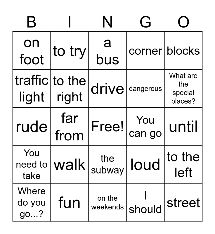 This bingo card has a free space and 37 words: How can I get to...?, Go straight, turn, to the right, to the left, walk, drive, cross, blocks, close to, far from, corner, street, until, traffic light, You need to take, a train, a bus, the subway, You can go, on foot, What are the special places?, Where do you go...?, on the weekends, You should, I should, to try, a parade, What is the city like?, the population, the people, fun, rude, diverse, loud, dangerous and safe.