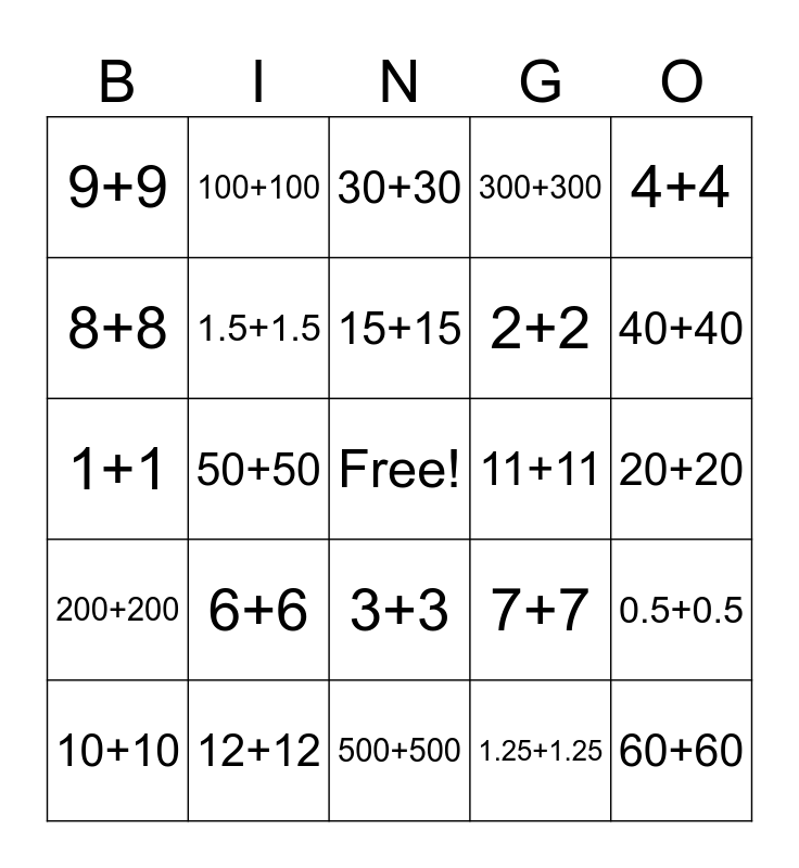 This bingo card has a free space and 24 words: 6+6, 12+12, 15+15, 10+10, 4+4, 9+9, 8+8, 100+100, 11+11, 3+3, 2+2, 1+1, 7+7, 0.5+0.5, 1.5+1.5, 1.25+1.25, 20+20, 30+30, 40+40, 50+50, 60+60, 200+200, 300+300 and 500+500.