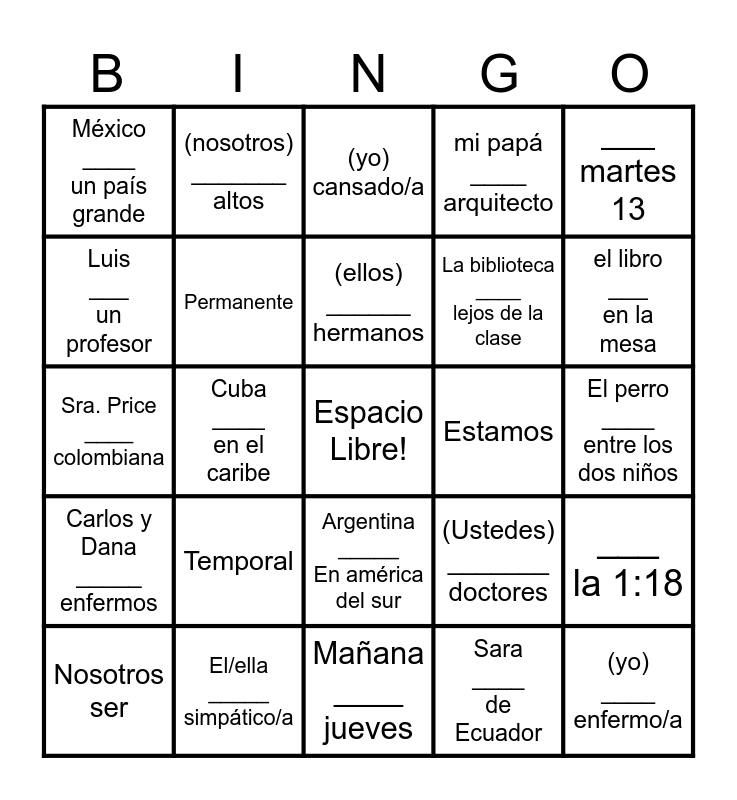 This bingo card has a free space and 34 words: (ellos) ____ estudiantes, Sara ____ de Ecuador, (Nosotras) ________ corriendo, (tú) ____ perfecto/a, Carlos y Dana _____ enfermos, Permanente, ___ martes 13, Nosotros ser, (nosotros) _______ altos, _____ las 2:35, (ellos) ______ hermanos, (yo) cansado/a, (yo) ______ mintiendo, ___ el 4 de julio, Estamos, el libro ___ en la mesa, El/ella _____ simpático/a, Sra. Price ____ colombiana, Temporal, (Ustedes) _______ doctores, Argentina _____ En américa del sur, (tú) ________ Feliz, México ____ un país grande, El perro ____ entre los dos niños, Mañana ____ jueves, (yo) ____ enfermo/a, mi papá ____ arquitecto, Boston y Littleton _____ en Massachusetts, La biblioteca ____ lejos de la clase, Luis ___ un profesor, Las tortugas marinas ____ en los Galápagos, Cuba ____ en el caribe, ___ la 1:18 and La clase ____ confundida.