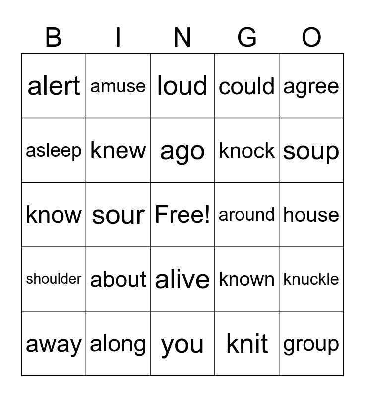 This bingo card has a free space and 24 words: about, along, ago, away, agree, alert, asleep, amuse, around, alive, knock, know, known, knuckle, knew, knit, house, loud, soup, sour, group, shoulder, could and you.