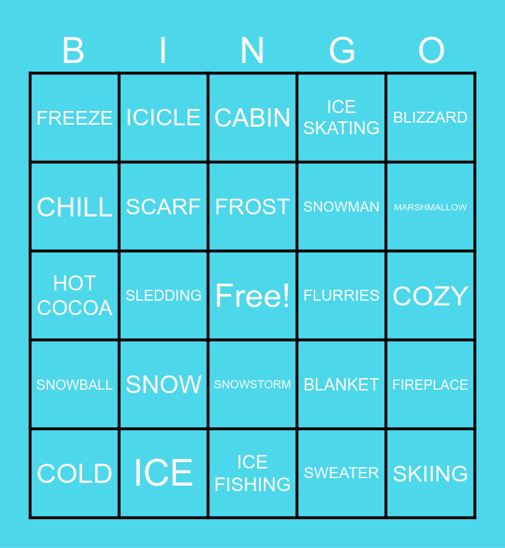 This bingo card has a free space and 24 words: SNOW, ICE, FROST, COLD, BLIZZARD, FREEZE, CHILL, ICICLE, FLURRIES, SNOWSTORM, SNOWMAN, HOT COCOA, BLANKET, FIREPLACE, SCARF, SWEATER, COZY, CABIN, MARSHMALLOW, SLEDDING, SKIING, SNOWBALL, ICE SKATING and ICE FISHING.
