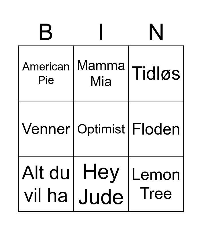 This bingo card has 27 words: Wonderwall, All my Loving, Lemon Tree, Forbuden frukt, Floden, Tidløs, Mamma Mia, Hit Me Baby One More Time, Idyll, Alt for Norge, En solskinnsdag, Venner, Bursdagssang, Spannish steps, House by the sea, Min Første Kjærlighet, Alt du vil ha, Hey Jude, Tusen Bitar, American Pie, Piano Man, Your song, Granada, Aldri i livet, Ride Ranke, Optimist and Rumba med Gunn.