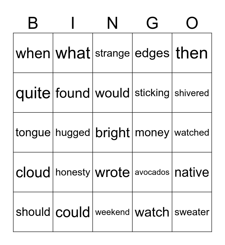 This bingo card has a free space and 24 words: honesty, could, would, should, then, when, quite, what, money, wrote, sticking, tongue, avocados, native, found, watch, watched, strange, shivered, hugged, sweater, cloud, edges and weekend.