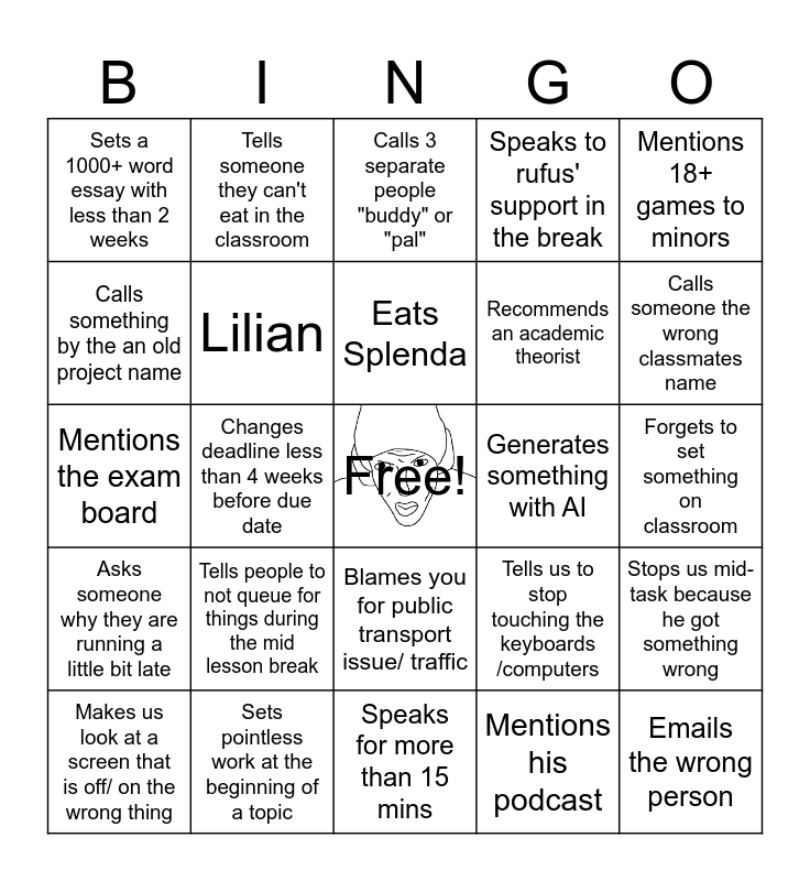 This bingo card has a free space and 31 words: Speaks for more than 15 mins, Calls out 1 person to check how they are doing, Changes deadline less than 4 weeks before due date, Talks about the male gaze, Sets a 1000+ word essay with less than 2 weeks, Calls 3 separate people "buddy" or "pal", Lilian, Tells us to stop touching the keyboards /computers, Generates something with AI, Mentions his podcast, Forgets to set something on classroom, Emails the wrong person, May-a, Fran/ Freya ward, Calls someone the wrong classmates name, Has to leave the class to speak to Emily, Stops us mid-task because he got something wrong, Tells people to not queue for things during the mid lesson break, Asks someone why they are running a little bit late, Blames you for public transport issue/ traffic, Mentions 18+ games to minors, Has ChatGPT open, Makes us look at a screen that is off/ on the wrong thing, Tells someone they can't eat in the classroom, Recommends an academic theorist, Calls something by the an old project name, Speaks to rufus' support in the break, Mentions the exam board, Sets pointless work at the beginning of a topic, Eats Splenda and "Can I have your attention for a moment".