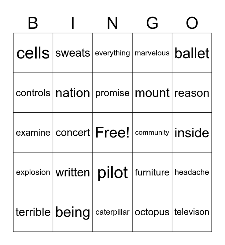 This bingo card has a free space and 24 words: written, being, promise, terrible, ballet, cells, controls, sweats, community, pilot, mount, examine, furniture, headache, nation, octopus, inside, everything, reason, concert, televison, explosion, marvelous and caterpillar.