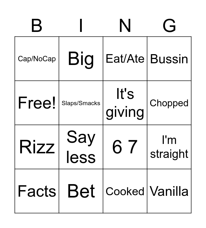 This bingo card has 16 words: Bet, I'm straight, Eat/Ate, Cap/NoCap, Rizz, Big, 6 7, Cooked, Free!, Slaps/Smacks, Facts, Bussin, Say less, Chopped, It's giving and Vanilla.