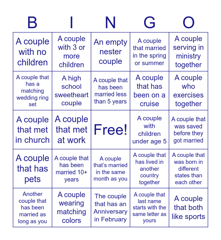 This bingo card has a free space and 24 words: Another couple that has been married as long as you, A couple that has been married 10+ years, A couple that has been married less than 5 years, A couple that last name starts with the same letter as yours, A couple serving in ministry together, A couple with no children, A couple with 3 or more children, An empty nester couple, A couple with children under age 5, A couple that was saved before they got married, A couple that met in church, A high school sweetheart couple, A couple that has lived in another country together, A couple that was born in different states than each other, A couple that has a matching wedding ring set, A couple wearing matching colors, The couple that has an Anniversary in February, A couple that married in the spring or summer, A couple who exercises together, A couple that has pets, A couple that met at work, A couple that’s married in the same month as you, A couple that has been on a cruise and A couple that both like sports.
