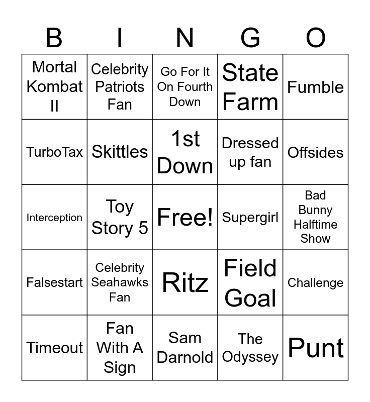 This bingo card has a free space and 35 words: Pringles, Uber Eats, Instacart, Skittles, Ritz, State Farm, TurboTax, Hims, 1st Down, Touch Down, Interception, Fumble, Sack, Avengers: Dooms Day, Mortal Kombat II, Supergirl, The Odyssey, Toy Story 5, Falsestart, Punt, Field Goal, Timeout, Challenge, Fan With A Sign, Go For It On Fourth Down, Offsides, Angry Fan, Snow/rain, Dressed up fan, Bad Bunny Halftime Show, Fireworks, Sam Darnold, Celebrity Seahawks Fan, Celebrity Patriots Fan and National Anthem.