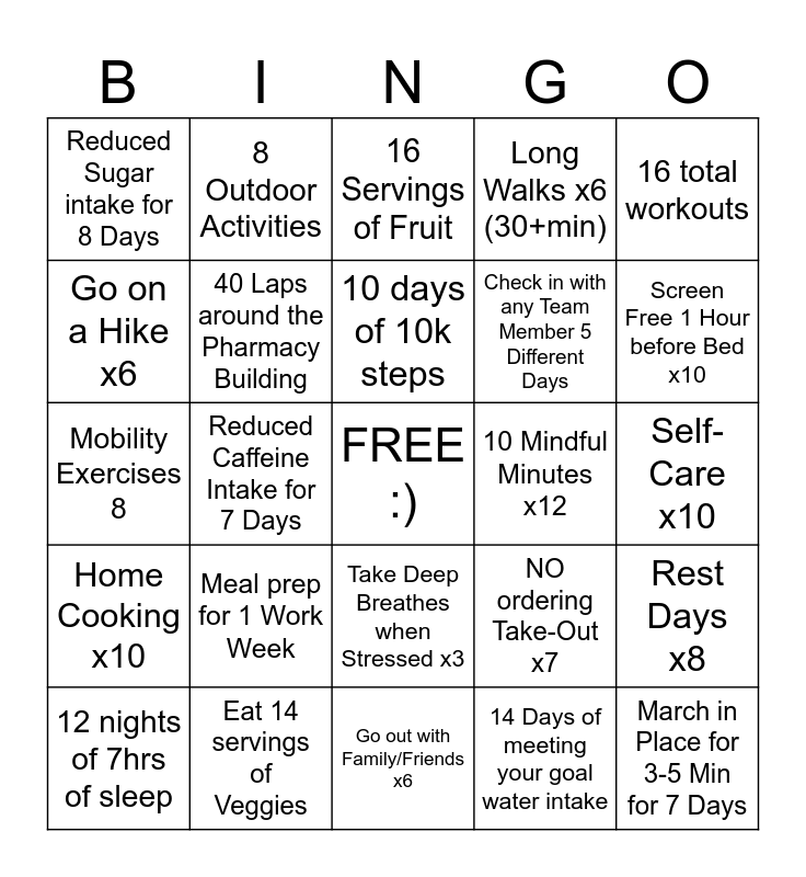 This bingo card has a free space and 24 words: 12 nights of 7hrs of sleep, Meal prep for 1 Work Week, 10 days of 10k steps, 14 Days of meeting your goal water intake, 16 total workouts, Reduced Sugar intake for 8 Days, 8 Outdoor Activities, 16 Servings of Fruit, 10 Mindful Minutes x12, Self-Care x10, Mobility Exercises 8, 40 Laps around the Pharmacy Building, NO ordering Take-Out x7, Rest Days x8, Go on a Hike x6, Eat 14 servings of Veggies, Go out with Family/Friends x6, Long Walks x6 (30+min), Screen Free 1 Hour before Bed x10, Home Cooking x10, Reduced Caffeine Intake for 7 Days, Take Deep Breathes when Stressed x3, Check in with any Team Member 5 Different Days and March in Place for 3-5 Min for 7 Days.