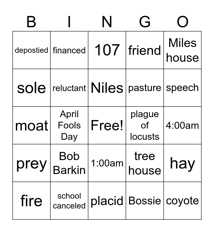This bingo card has a free space and 42 words: Miles, Niles, Principal Barkin, Bob Barkin, Bossie, hay, coyote, two, 107, 1:00am, 4:00am, speech, April Fools Day, Miles house, closet, tree house, go down stairs, moat, hoaxes, financed, sole, complement, apprehenshion, depostied, exhilarating, rendezvous, pasture, all black, stensan, pop up tent, man in boxers, prey, reluctant, placid, panic, fire, school canceled, plague of locusts, year of detention, no ratting, friend and wingtips.