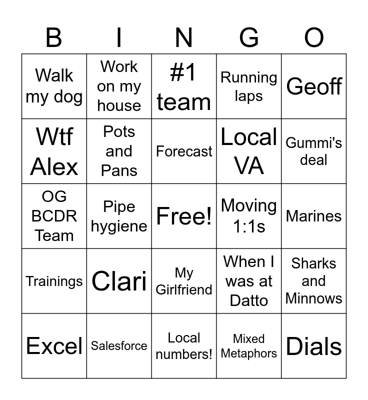 This bingo card has a free space and 24 words: Clari, Salesforce, Forecast, Excel, Geoff, Walk my dog, Wtf Alex, Work on my house, Moving 1:1s, My Girlfriend, Local VA, OG BCDR Team, When I was at Datto, Sharks and Minnows, Pots and Pans, Mixed Metaphors, Marines, #1 team, Gummi's deal, Pipe hygiene, Dials, Trainings, Running laps and Local numbers!.