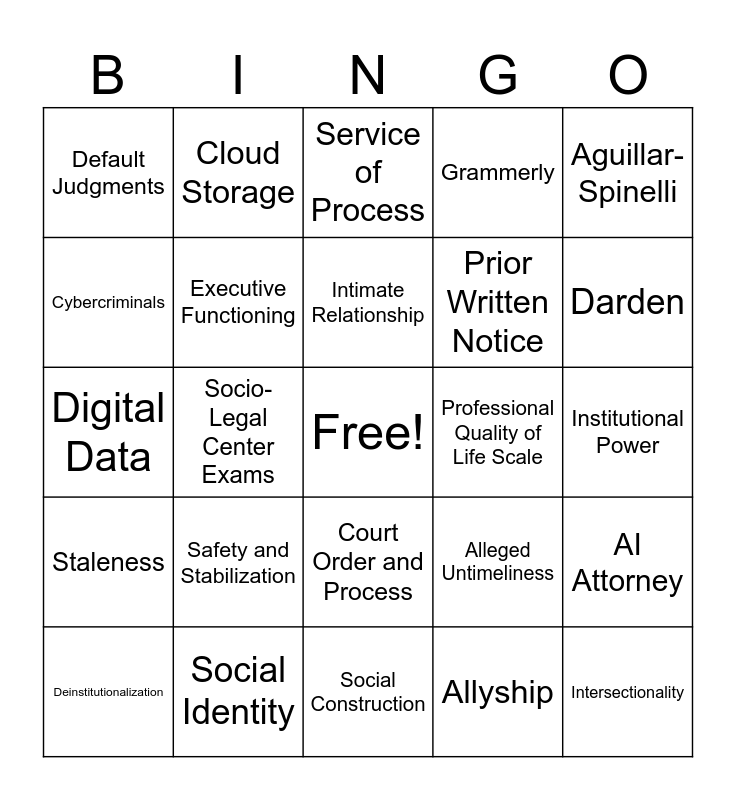 This bingo card has a free space and 29 words: Deinstitutionalization, Temporary Order of Observation, Socio-Legal Center Exams, Settlement Conferences, Default Judgments, Service of Process, Executive Functioning, Safety and Stabilization, Professional Quality of Life Scale, Social Identity, Institutional Power, Intersectionality, Social Construction, Allyship, Darden, Constitution, Court Order and Process, Staleness, Aguillar-Spinelli, Digital Data, Alleged Untimeliness, Forum Non Conveniens, Prior Written Notice, Cybercriminals, Grammerly, Cloud Storage, AI Attorney, Intimate Relationship and Red Flags.