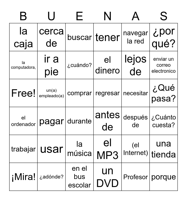 This bingo card has 36 words: el MP3, la música, un DVD, la computadora,, el ordenador, regresar, ir a pie, en el bus escolar, navegar la red, (el Internet), enviar un correo electronico, tener, una tienda, un(a) empleado(a), el dinero, la caja, trabajar, necesitar, Free!, buscar, comprar, pagar, antes de, durante, después de, cerca de, lejos de, ¿adónde?, ¿cuándo?, ¿por qué?, porque, ¡Mira!, ¿Cuánto cuesta?, ¿Qué pasa?, usar and Profesor.