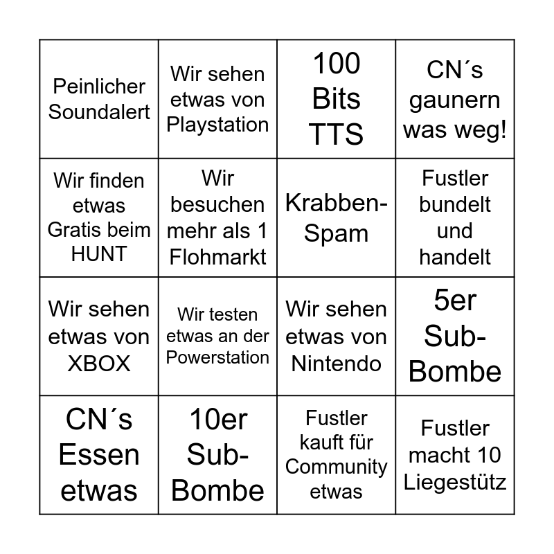 This bingo card has 16 words: 10er Sub-Bombe, 5er Sub-Bombe, 100 Bits TTS, Peinlicher Soundalert, Wir sehen etwas von XBOX, Wir sehen etwas von Playstation, Wir sehen etwas von Nintendo, Fustler kauft für Community etwas, Wir finden etwas Gratis beim HUNT, Wir besuchen mehr als 1 Flohmarkt, CN´s Essen etwas, CN´s gaunern was weg!, Wir testen etwas an der Powerstation, Fustler bundelt und handelt, Krabben-Spam and Fustler macht 10 Liegestütz.