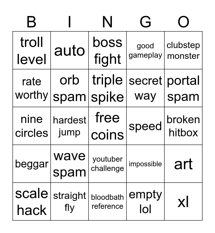This bingo card has a free space and 24 words: wave spam, straight fly, triple spike, scale hack, clubstep monster, troll level, rate worthy, auto, speed, youtuber challenge, secret way, nine circles, impossible, art, orb spam, empty lol, broken hitbox, boss fight, portal spam, hardest jump, xl, beggar, good gameplay and bloodbath reference.