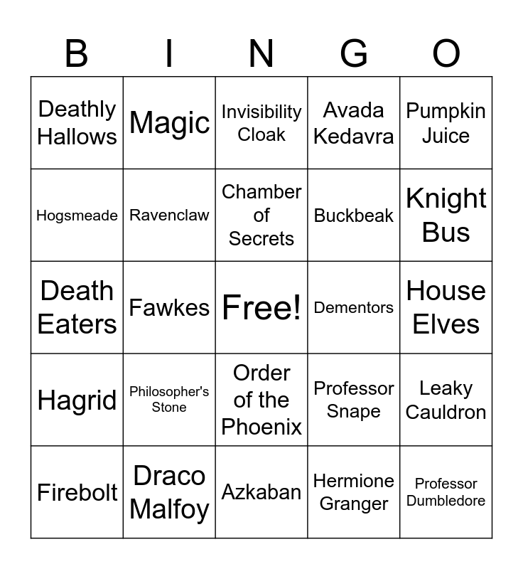 This bingo card has a free space and 52 words: Hogwarts, Professor Dumbledore, Hufflepuff, Azkaban, Philosopher's Stone, Gryffindor, Magic, Slytherin, Hogsmeade, Elder wand, Ravenclaw, Ministry of Magic, Leaky Cauldron, Professor Snape, Diagon Alley, Professor McGonagall, Chamber of Secrets, Dementors, Harry Potter, Pumpkin Juice, Fawkes, Hermione Granger, Deathly Hallows, Buckbeak, Ron Weasley, Horcruxes, The Burrow, Triwizard Tournament, Knight Bus, Ginny Weasley, The Dursley's, Avada Kedavra, Fred & George Weasley, Platform 9 3/4, Voldemort, Invisibility Cloak, Draco Malfoy, Expelliarmus, Neville Longbottom, Quidditch, Luna Lovegood, House Elves, Hagrid, Sirius Black, Order of the Phoenix, Marauder's Map, Remus Lupin, Death Eaters, Whomping Willow, Forbidden Forest, Firebolt and Stupefy.