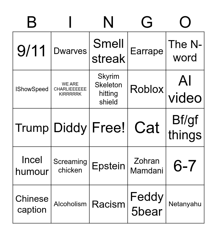 This bingo card has a free space and 24 words: Chinese caption, Screaming chicken, Skyrim Skeleton hitting shield, Feddy 5bear, The N-word, 9/11, Dwarves, Smell streak, Cat, Bf/gf things, Trump, WE ARE CHARLIEEEEEE KIRRRRRK, Zohran Mamdani, 6-7, IShowSpeed, Alcoholism, Racism, Earrape, AI video, Incel humour, Diddy, Epstein, Roblox and Netanyahu.