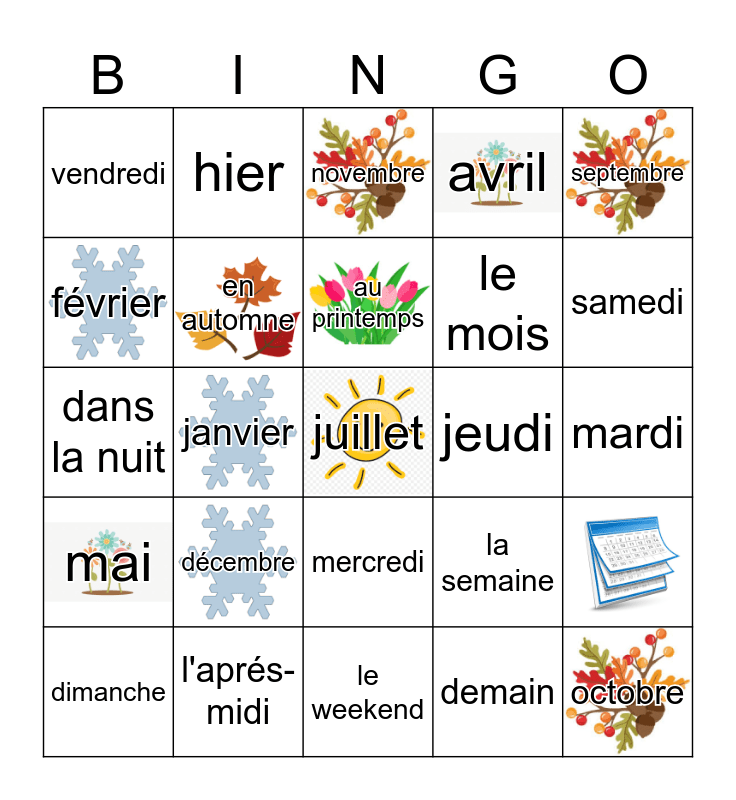This bingo card has 16 images, a free space and 36 words: en hiver, mars, en été, en automne, décembre, au printemps, juin, septembre, lundi, janvier, avril, octobre, mardi, février, mai, août, novembre, mercredi, jeudi, vendredi, samedi, dimanche, le weekend, aujourd'hui, demain, hier, le lendemain, après l'école, avant l'école, le soir, l'aprés-midi, dans la nuit, le matin, la semaine, le mois and l'année.