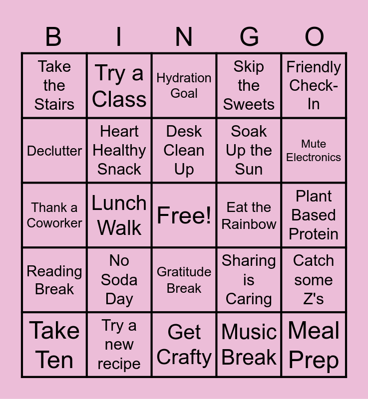 This bingo card has a free space and 29 words: Take Ten, Stretch Break, Lunch Walk, Leg Day, Take the Stairs, Hydration Goal, Heart Healthy Snack, No Soda Day, Eat the Rainbow, Try a new recipe, Plant Based Protein, Meal Prep, Get Crafty, Music Break, Mute Electronics, 5 Minute Breather, Gratitude Break, Reading Break, Friendly Check-In, Thank a Coworker, Sharing is Caring, Step Tracking, Soak Up the Sun, Declutter, Skip the Sweets, Try a Class, Catch some Z's, Desk Clean Up and Share a Win.