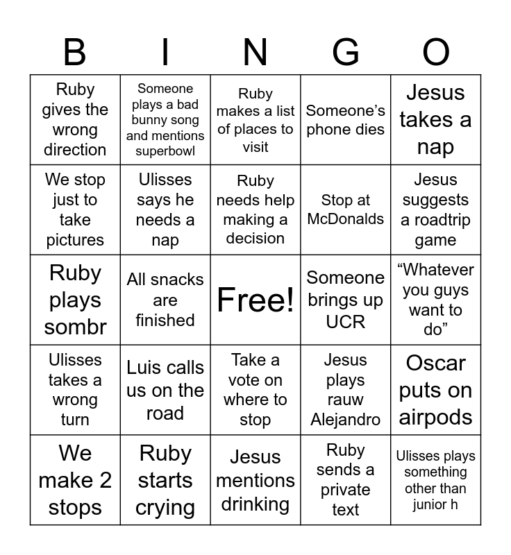 This bingo card has a free space and 24 words: Luis calls us on the road, Ruby starts crying, Ruby needs help making a decision, We make 2 stops, Jesus takes a nap, Ruby gives the wrong direction, We stop just to take pictures, Someone plays a bad bunny song and mentions superbowl, Someone brings up UCR, Take a vote on where to stop, Stop at McDonalds, Ruby plays sombr, Jesus plays rauw Alejandro, Oscar puts on airpods, Ulisses says he needs a nap, Ruby sends a private text, “Whatever you guys want to do”, Ruby makes a list of places to visit, Jesus suggests a roadtrip game, All snacks are finished, Ulisses plays something other than junior h, Ulisses takes a wrong turn, Someone’s phone dies and Jesus mentions drinking.