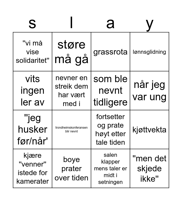 This bingo card has 16 words: boye prater over tiden, kjøttvekta, grassrota, ''vi må vise solidaritet'', ''jeg husker før/når', støre må gå, fortsetter og prate høyt etter tale tiden, salen klapper mens taler er midt i setningen, vits ingen ler av, nevner en streik dem har vært med i, kjære ''venner'' istede for kamerater, lønnsglidning, trondheimskonferansen blir nevnt, når jeg var ung, som ble nevnt tidligere and ''men det skjede ikke''.