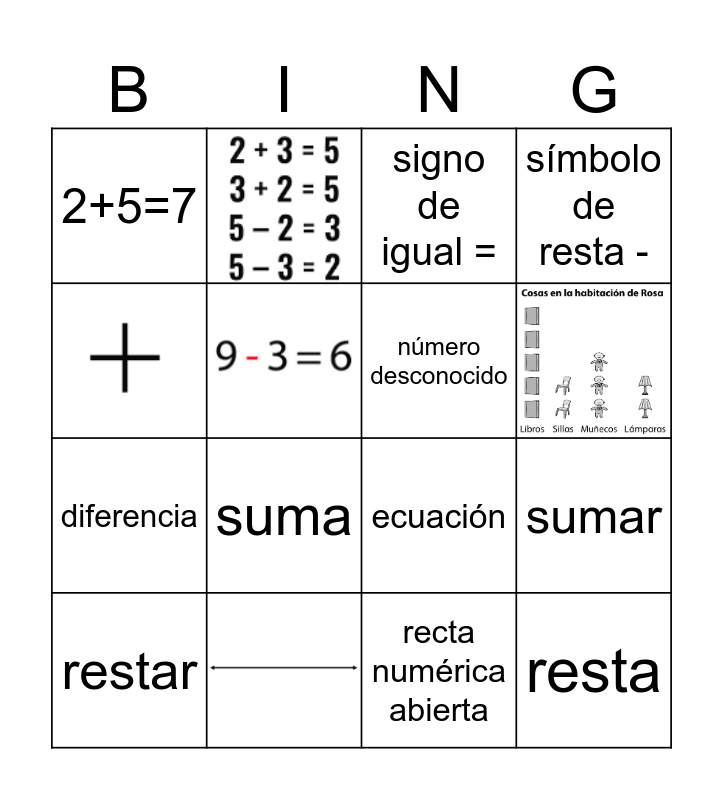 This bingo card has 8 images and 16 words: ¡Gratis!, 2+5=7, diferencia, ecuación, familia de datos, gráfica de barras, número desconocido, pictografía, recta numérica abierta, signo de igual =, suma, sumar, restar, resta, símbolo de resta - and símbolo de suma +.