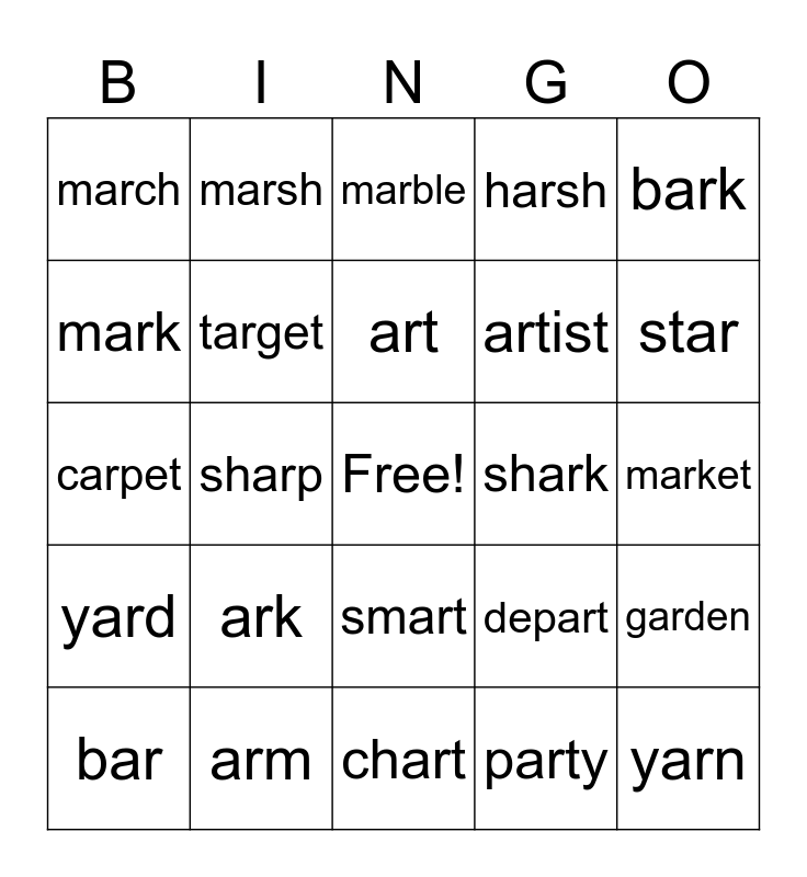 This bingo card has a free space and 24 words: ark, arm, art, bar, bark, march, mark, marsh, shark, smart, artist, carpet, depart, garden, target, party, market, marble, star, sharp, yarn, yard, harsh and chart.