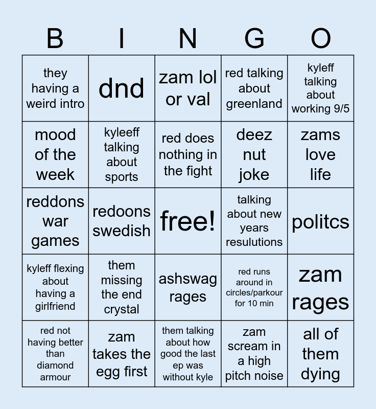 This bingo card has a free space and 24 words: them missing the end crystal, zam takes the egg first, red does nothing in the fight, red not having better than diamond armour, kyleff talking about working 9/5, they having a weird intro, mood of the week, dnd, talking about new years resulutions, ashswag rages, deez nut joke, reddons war games, red runs around in circles/parkour for 10 min, zam rages, kyleeff talking about sports, zam scream in a high pitch noise, politcs, zam lol or val, zams love life, redoons swedish, all of them dying, kyleff flexing about having a girlfriend, red talking about greenland and them talking about how good the last ep was without kyle.