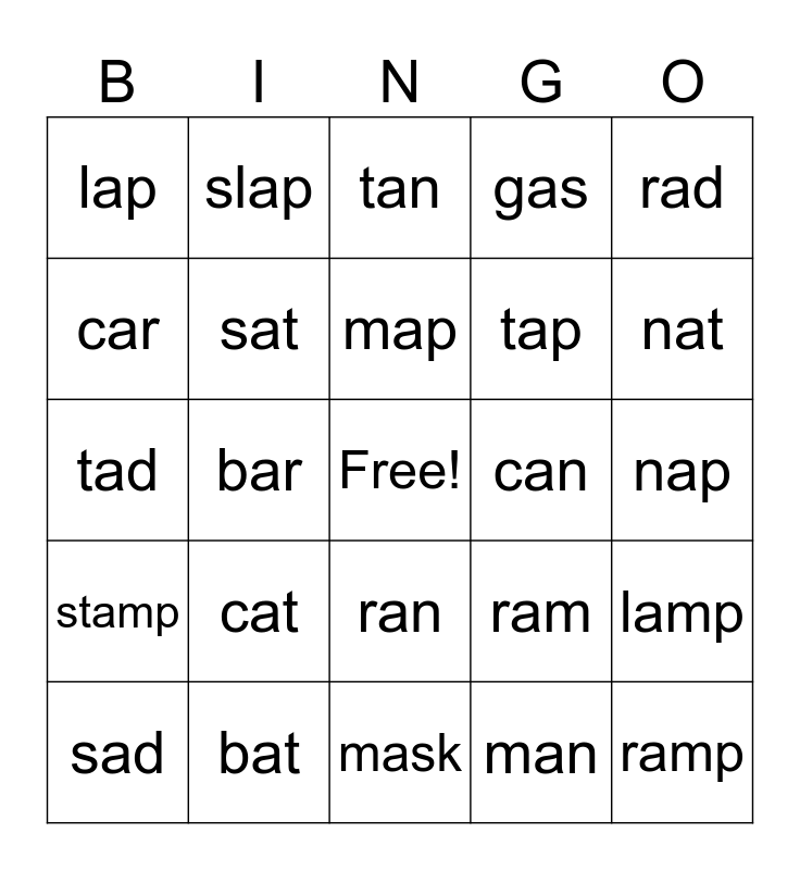 This bingo card has a free space and 24 words: cat, bat, map, sad, rad, lap, car, slap, can, ran, tap, tad, ram, lamp, sat, man, nap, tan, nat, bar, ramp, stamp, gas and mask.