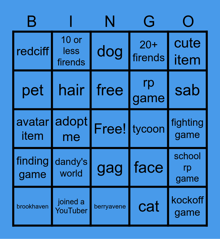 This bingo card has a free space and 29 words: brookhaven, robux, adopt me, royal high, redciff, dog, hair, dandy's world, tycoon, joined a YouTuber, fighting game, kockoff game, berryavene, cat, sab, dti, gag, finding game, cute item, avatar item, face, pointless game, rp game, pet, 20+ firends, 10 or less firends, school rp game, free and free.