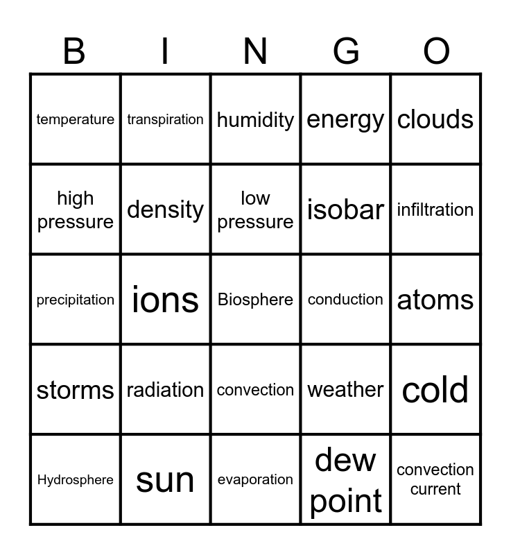 This bingo card has 45 words: Atmosphere, Biosphere, Geosphere, Hydrosphere, dew, dew point, humidity, relative humidity, clouds, sun, energy, conduction, convection, radiation, transfer, evaporation, condensation, precipitation, runoff, infiltration, transpiration, barometer, air, temperature, kinetic energy, atoms, molecules, particles, weather, storms, air mass, cold, hot, equator, wind, ions, altitude, air pressure, convection current, low pressure, high pressure, isobar, volume, density and mass.