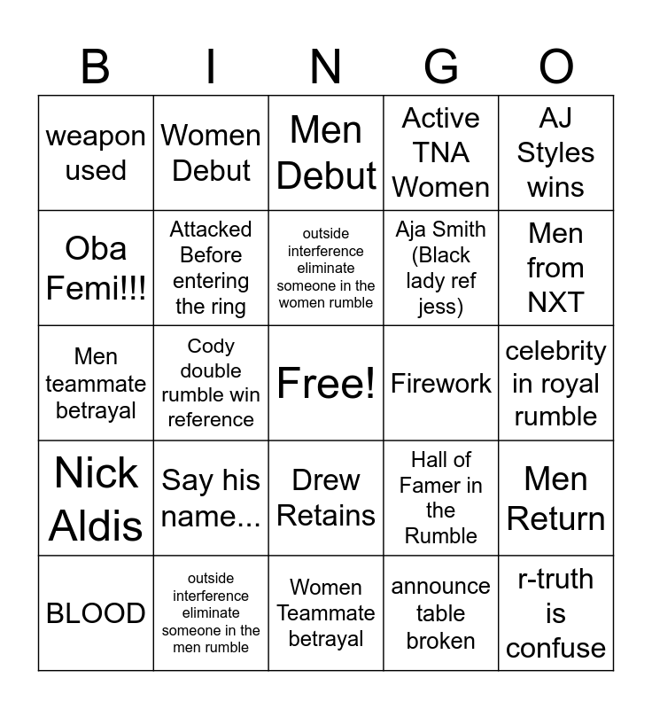 This bingo card has a free space and 42 words: Pat McCafee Returns, outside interference eliminate someone in the women rumble, Adam Pearce, Say his name..., announce table broken, Men Return, r-truth is confuse, Claymore!!, Men Debut, Drew Retains, celebrity in royal rumble, Men from NXT, Cody double rumble win reference, AJ Styles wins, Bianca Return, Hall of Famer in the Rumble, Women Return, Men teammate betrayal, double elimination, Women Debut, Oba Femi!!!, Women from NXT, 'oh my god', weapon used, Charles Robinson, Lady Ref Jess, Aja Smith (Black lady ref jess), (___________) Win the Men Royal Rumble, (____________) Win the Women Royal Rumble, Big Face in the Crowd, ''daddy cool'' type of chant, Nick Aldis, Attacked Before entering the ring, Women Teammate betrayal, Costume malfunction, BLOOD, outside interference eliminate someone in the men rumble, Firework, Active AAA Women, Active AAA Men, Active TNA Women and Active TNA Men.