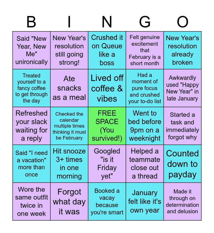 This bingo card has a free space and 24 words: Hit snooze 3+ times in one morning, Forgot what day it was, Lived off coffee & vibes, Wore the same outfit twice in one week, New Year's resolution already broken, Said "New Year, New Me" unironically, Treated yourself to a fancy coffee to get through the day, New Year's resolution still going strong!, Went to bed before 9pm on a weeknight, Googled "is it Friday yet", Had a moment of pure focus and crushed your to-do list, Refreshed your slack waiting for a reply, Helped a teammate close out a thread, Counted down to payday, Ate snacks as a meal, January felt like it's own year, Started a task and immediately forgot why, Crushed it on Queue like a boss, Awkwardly used "Happy New Year" in late January, Checked the calendar multiple times thinking it must be February, Made it through on determination and delusion, Said "I need a vacation" more than once, Felt genuine excitement that February is a short month and Booked a vacay because you're smart.