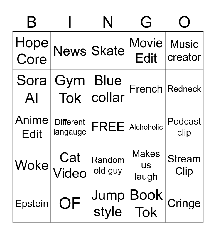This bingo card has a free space and 24 words: Cat Video, OF, Blue collar, Epstein, Music creator, Hope Core, Sora AI, News, Alchoholic, Random old guy, French, Anime Edit, Makes us laugh, Stream Clip, Gym Tok, Book Tok, Podcast clip, Skate, Redneck, Different langauge, Cringe, Woke, Movie Edit and Jump style.