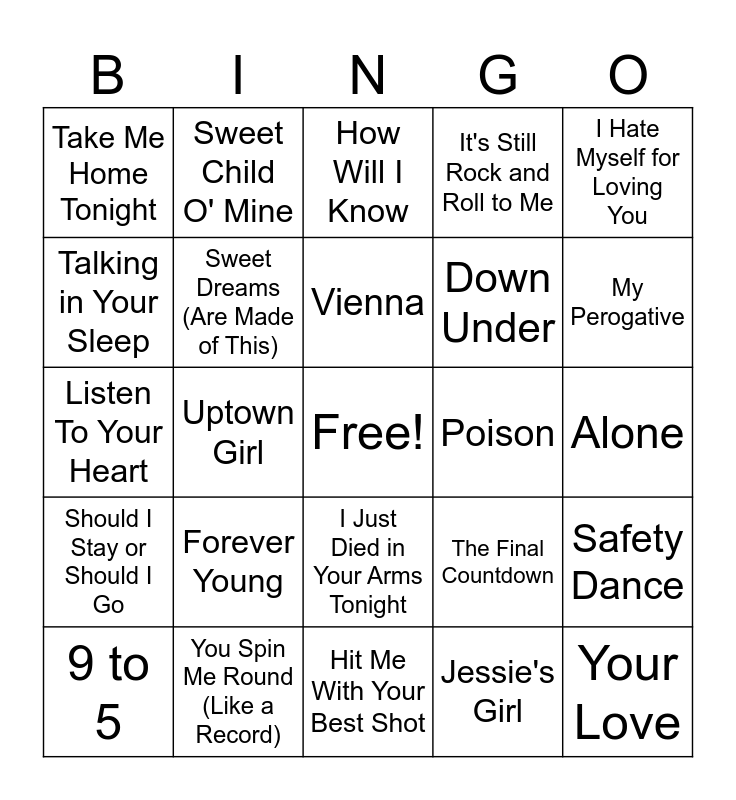 This bingo card has a free space and 59 words: Girls Just Want to Have Fun, You Spin Me Round (Like a Record), Billie Jean, Should I Stay or Should I Go, Jessie's Girl, Wake Me Up Before You Go-Go, Sweet Dreams (Are Made of This), Total Eclipse of the Heart, Down Under, Walk Like an Egyptian, It's Still Rock and Roll to Me, Danger Zone, Talking in Your Sleep, Working for the Weekend, Dancing in the Dark, Take Me Home Tonight, Your Love, I Hate Myself for Loving You, Never Gonna Give You Up, Vienna, Poison, How Will I Know, 9 to 5, Safety Dance, Celebration, I Think We're Alone Now, What I Like About You, We Didn't Start the Fire, My Perogative, Heaven Is a Place on Earth, Jump, Private Eyes, You Give Love a Bad Name, Take On Me, Sweet Child O' Mine, Living On A Prayer, I'm Still Standing, Uptown Girl, Can't Fight This Feeling, Listen To Your Heart, Radio Ga-Ga, Forever Young, Alone, Piano Man, Material Girl, Every Breath You Take, Summer of '69, We Built This City, I Just Died in Your Arms Tonight, Hit Me With Your Best Shot, Heat of the Moment, Don't You (Forget About Me), Footloose, Eye of the Tiger, Tainted Love, The Final Countdown, Beat It, Centerfold and Karma Chameleon.