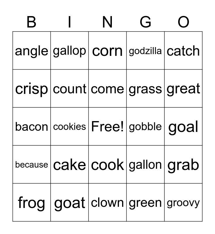 This bingo card has a free space and 24 words: cake, goat, come, frog, catch, angle, crisp, gallop, gobble, cook, grass, bacon, gallon, grab, count, green, goal, corn, great, cookies, groovy, because, godzilla and clown.