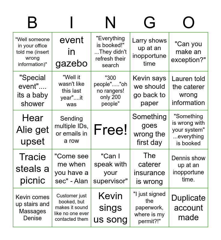 This bingo card has a free space and 29 words: Patty Manship Visits, Customer just booked, but makes it sound like no one ever contacted them, "Everything is booked!" ...They didn't refresh their search, "Can I book for next year?", "Can you make an exception?", "Well someone in your office told me (insert wrong information)", "Well it wasn't like this last year"....it was, "300 people"....."oh no rangers! only 200 people", Something goes wrong the first day, Dennis show up at an inopportune time., Kevin comes up stairs and Massages Denise, Sending multiple IDs, or emails in a row, "I just signed the paperwork, where is my permit?!", Duplicate account made, Hear Alie get upset, Customer needs help in person, Kevin sings us song, The caterer insurance is wrong, Lauren told the caterer wrong information, Tracie steals a picnic, "Come see me when you have a sec" - Alan, Alan Shows up/asks for a favor at an inopportune time, Kevin says we should go back to paper, "Something is wrong with your system" ...everything is booked, "Special event".... its a baby shower, event in gazebo, "Can I speak with your supervisor", Larry shows up at an inopportune time and Kevin shows up at an inopportune time.