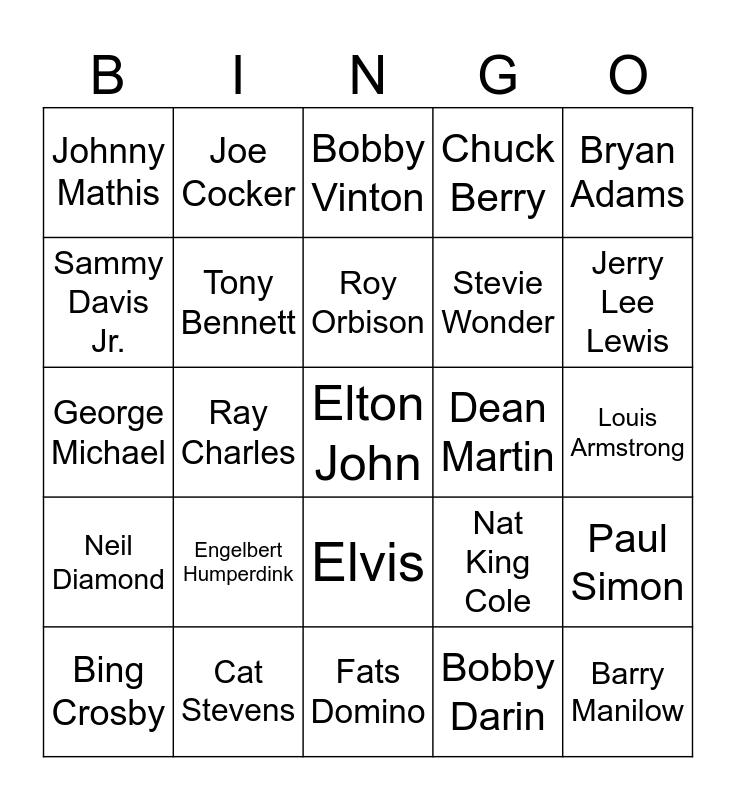 This bingo card has a free space and 44 words: Andy Williams, Barry Manilow, Billy Joel, Bing Crosby, Bob Dylan, Bobby Darin, Bobby Vinton, Bruce Springsteen, Bryan Adams, Cat Stevens, Chuck Berry, Dean Martin, Elvis, Engelbert Humperdink, Eric Clapton, Fats Domino, Frank Sinatra, George Michael, James Taylor, Jerry Lee Lewis, Joe Cocker, John Lennon, Johnny Cash, Johnny Mathis, Josh Groban, Louis Armstrong, Luther Vandross, Marvin Gaye, Nat King Cole, Neil Diamond, Paul McCartney, Paul Simon, Perry Como, Phil Collins, Ray Charles, Ricky Nelson, Ritchie Valens, Rod Stewart, Roy Orbison, Sammy Davis Jr., Stevie Wonder, Tom Jones, Tony Bennett and Willie Nelson.