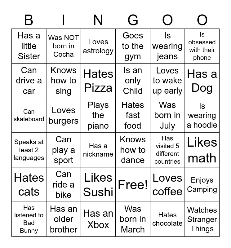This bingo card has 36 words: Free!, Likes Sushi, Was born in March, Can drive a car, Speaks at least 2 languages, Hates fast food, Knows how to sing, Has an Xbox, Is wearing jeans, Loves coffee, Has a Dog, Goes to the gym, Enjoys Camping, Loves burgers, Is an only Child, Has a little Sister, Hates cats, Was born in July, Can skateboard, Loves astrology, Plays the piano, Can play a sport, Knows how to dance, Has a nickname, Has visited 5 different countries, Was NOT born in Cocha, Loves to wake up early, Has an older brother, Hates Pizza, Is obsessed with their phone, Watches Stranger Things, Has listened to Bad Bunny, Likes math, Is wearing a hoodie, Can ride a bike and Hates chocolate.