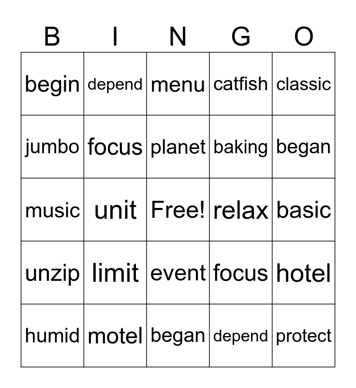 This bingo card has a free space and 30 words: motel, banjo, unit, robot, begin, menu, focus, event, relax, began, basic, protect, depend, dentist, began, insect, focus, unzip, limit, classic, music, program, depend, baking, jumbo, catfish, hotel, humid, planet and Venus.