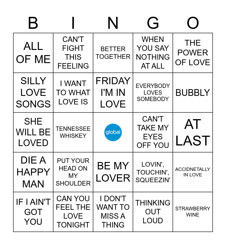 This bingo card has a free space and 41 words: ALL YOU NEED IS LOVE, SHE WILL BE LOVED, CAN'T HELP FALLING IN LOVE, I WANT TO WHAT LOVE IS, CAN YOU FEEL THE LOVE TONIGHT, BE MY LOVER, FRIDAY I'M IN LOVE, YOUR LOVE, THE POWER OF LOVE, DIE A HAPPY MAN, TENNESSEE WHISKEY, WHEN YOU SAY NOTHING AT ALL, STRAWBERRY WINE, AT LAST, CAN'T TAKE MY EYES OFF YOU, PUT YOUR HEAD ON MY SHOULDER, JUST THE WAY YOU ARE, ALL OF ME, LIL BOO THANG, BETTER TOGETHER, ACCIDNETALLY IN LOVE, HEY, SOUL SISTER, I DON'T WANT TO MISS A THING, EVERYBODY LOVES SOMEBODY, MY GIRL, FAITHFULLY, THINKING OUT LOUD, SMILE, BUBBLY, THIS MAGIC MOMENT, HOW DEEP IS YOUR LOVE, CAN'T FIGHT THIS FEELING, IF I AIN'T GOT YOU, CRAZY IN LOVE, LOVIN', TOUCHIN', SQUEEZIN', SILLY LOVE SONGS, HIGHER LOVE, PURPLE RAIN, FEELS LIKE THE FIRST TIME, MORE THAN A FEELING and SOMEBODY TO LOVE.
