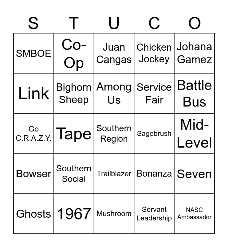 This bingo card has 41 words: Olivia Saliba, Go C.R.A.Z.Y., November 1991, Bighorn Sheep, 1967, Trailblazer, Among Us, February 14, Johana Gamez, Bowser, Tape, Chicken Jockey, Southern Region, Mid-Level, Sagebrush, Southern Social, Luca Petrucci, SMBOE, Xbox, Juan Cangas, Seven, NASC Ambassador, Mushroom, Service Fair, State Board, Legendary, Servant Leadership, Empathy, Battle Bus, Silver Star, Natural Disaster Survival, Co-Op, Ghosts, Pong, Bonanza, Link, Purple & Gold, Dress to Impress, 1985, Minecraft and D-Pad.