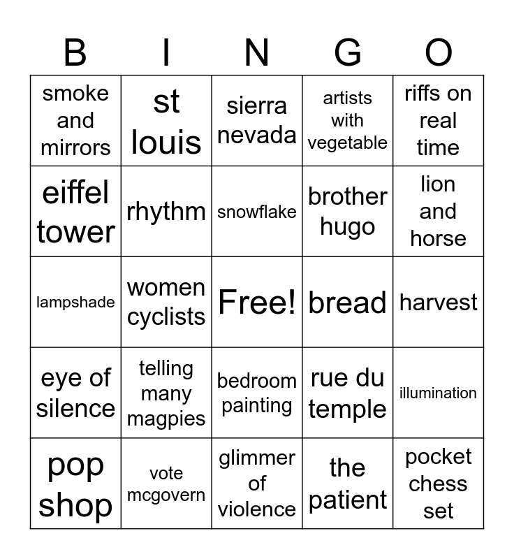 This bingo card has a free space and 24 words: telling many magpies, vote mcgovern, snowflake, pop shop, riffs on real time, smoke and mirrors, eiffel tower, st louis, bread, bedroom painting, brother hugo, lampshade, rue du temple, illumination, rhythm, the patient, harvest, sierra nevada, lion and horse, women cyclists, pocket chess set, eye of silence, artists with vegetable and glimmer of violence.