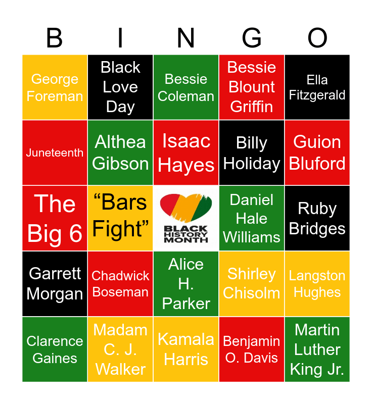 This bingo card has a free space and 29 words: Don Cheadle, Natalie Cole, Bessie Coleman, Benjamin O. Davis, Ella Fitzgerald, George Foreman, Althea Gibson, Isaac Hayes, Billy Holiday, Langston Hughes, Clarence Gaines, Chadwick Boseman, Shirley Chisolm, Martin Luther King Jr., The Big 6, Frederick Douglas, Kamala Harris, Daniel Hale Williams, Guion Bluford, Garrett Morgan, Madam C. J. Walker, Alice H. Parker, Bessie Blount Griffin, Ruby Bridges, Juneteenth, Black Love Day, Hiram Rhodes Revels, “Bars Fight” and Marcus Garvey.
