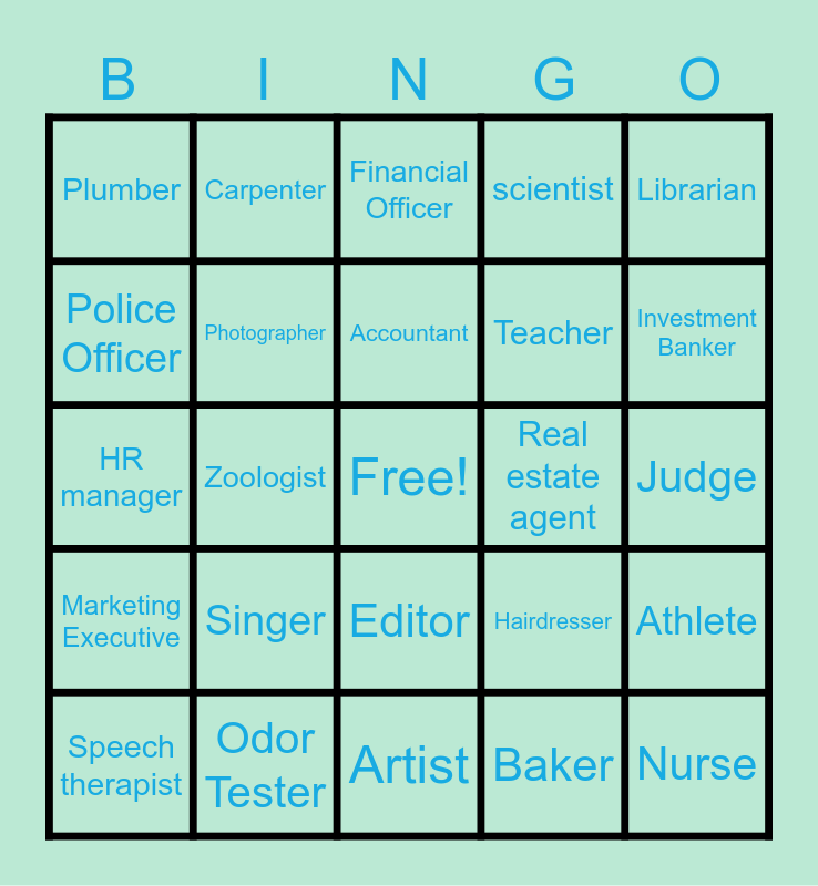 This bingo card has a free space and 49 words: Doctor, Nurse, Chef, Artist, Singer, Digital Marketer, Carpenter, Writer, Police Officer, Firefighter, Photographer, scientist, Athlete, Hairdresser, engineer, Mechanic, Accountant, Real estate agent, pilot, Librarian, Zoologist, Baker, Plumber, Teacher, Physician, Investment Banker, Speech therapist, Public Relations Specalist, Editor, Marketing Executive, Construction Manager, Graphic Designer, travel Agent, Event Planner, Odor Tester, Toy Designer, Magican, Air Traffic Controller, Judge, Hotel Manager, Welder, Film Director, School Counselor, Social Worker, HR manager, Financial Officer, Childcare Worker, Veterinarian and Operations manager.